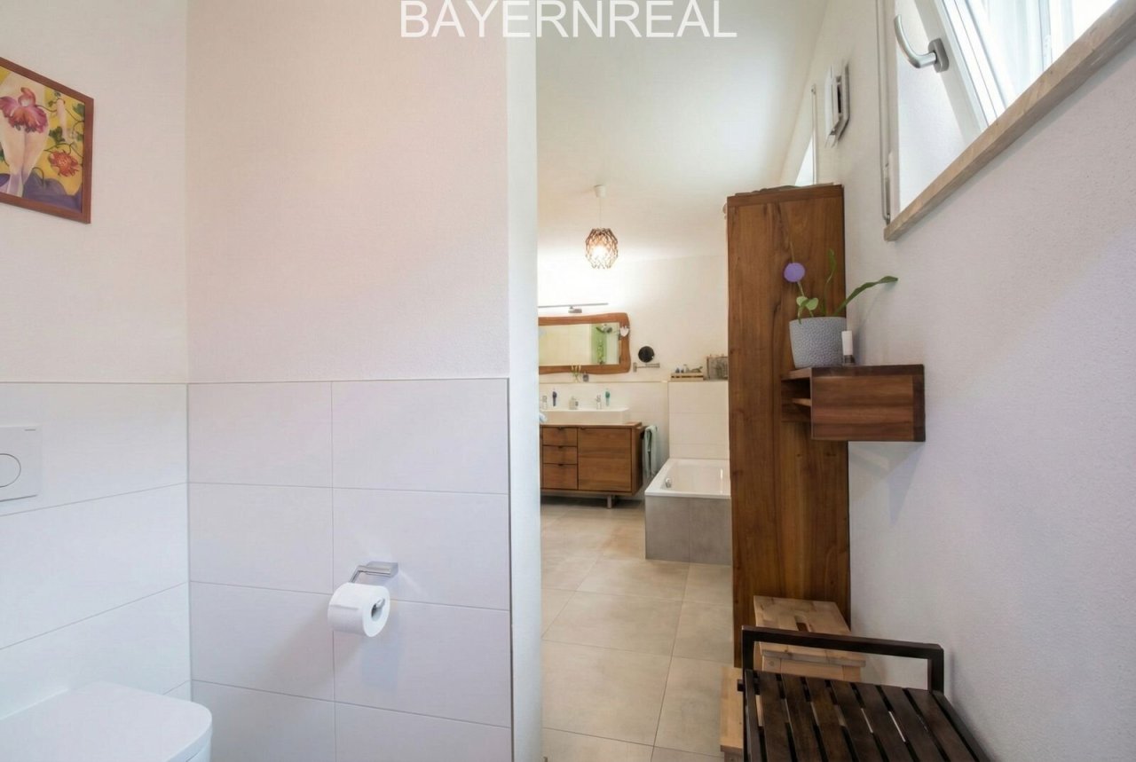 Das Tageslichtbad ist hochwertig ausgestattet mit Badewanne und Dusche; zusätzlich steht ein separates Gäste-WC zur Verfügung. Ein Waschmaschinenanschluss befindet sich direkt in der Wohnung (Badezimmer).